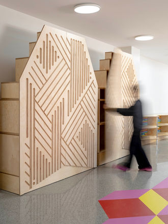 As part of a multi-year project, MOAD commissioned the designers of AMLgMATD to reinvent its existing education room and make it adaptable to the variety of educational programs offered by the Museum, ranging from lectures and workshops for adults and students to hands-on art-making activities with children. They created a dynamic array of bespoke cabinetry, furniture, and wall and floor coverings that can be reconfigured for multiple uses. Monochromatic wooden surfaces alternate with strategically deployed moments of strong, vivid colors. AMLgMATD used sustainable, healthy and recycled materials, and invented a unique and engaging hybrid style called “Tropical Cubism.”