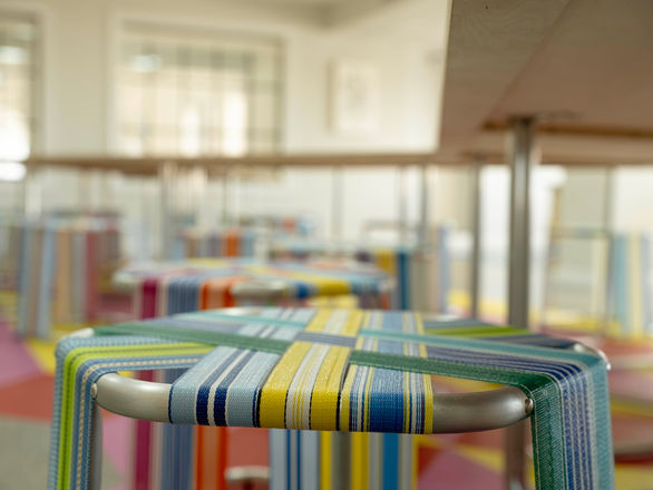 AMLgMATD’s design includes storage cabinets with carved designs on their doors, shelves that reveal colorful abstractions between shelves, work tables that can be arranged in a multitude of configurations, and geometric floor decals in hues bold designs that echo the optical designs wrapped around the low stools. Materials used include birch plywood, MDF (medium-density fiberboard, recycled from previous MOAD exhibits), aluminum tubing (60% recycled), vinyl laminate flooring, polypropylene webbing ( old unused stock) and environmentally friendly non-toxic coatings. The furniture was designed and built for the bedroom in small modules and assembled on site. The innovative design makes it easy to reconfigure the room and easily disassemble and reassemble furniture when needed. The furniture was custom made by master cabinetmaker Rudi Repenning. Moonlighter FabLab provided all CNC (Computer Numerical Control) services for the custom machine cutting and routing of the project.